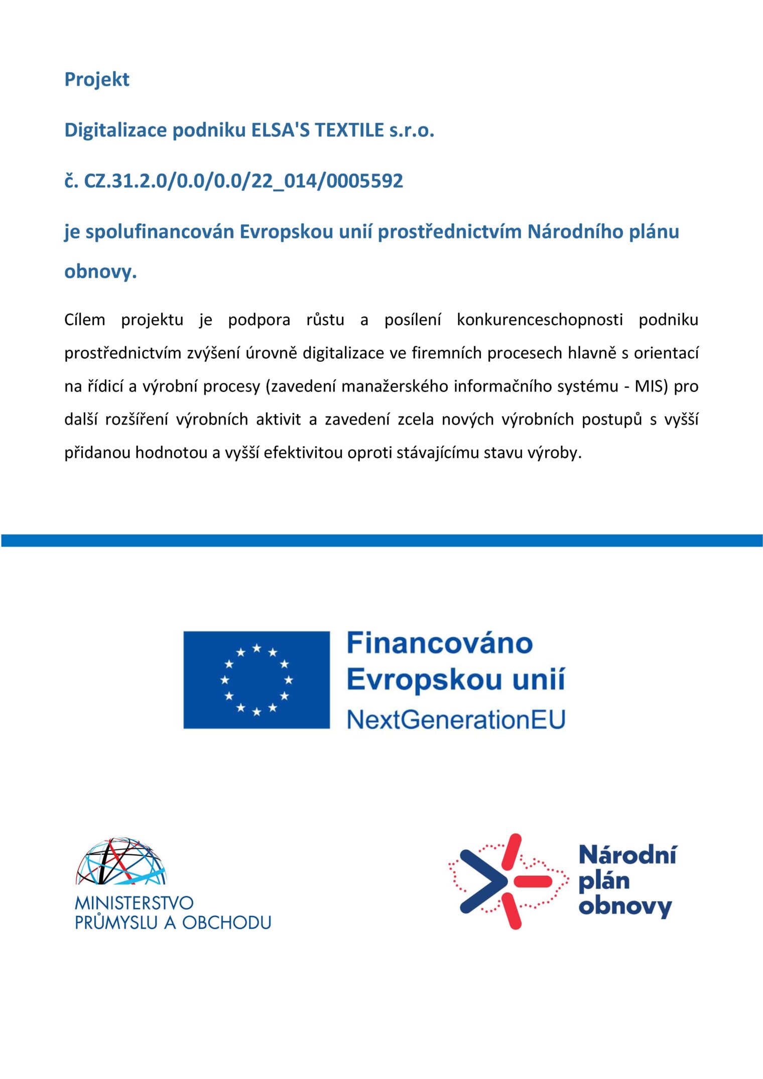 Elsa’s Textile s.r.o. realizuje vzdělávání zaměstnanců v období 2020 až 2022 v rámci projektu Vzdělávání 097 ELSAS TEXTILE, registrační číslo CZ.03.1.52/0.0/0.0/19_097/0013809.